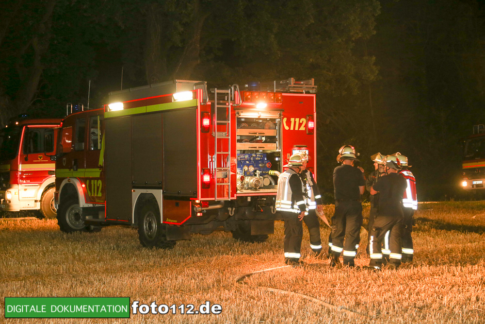 Noch auf der Anfahrt erkannten die ersten Einheiten das Ausmaß des Brandes. Es brannte eine große Strohernte an einem Feldrand. Der fortentwickelte Brand bedrohte durch die hohe Wärmestrahlung die angrenzenden Pflanzen- und Baumreihen sowie die dahinterliegenden Gebäude eines Garten- und Landschaftsbauunternehmens.