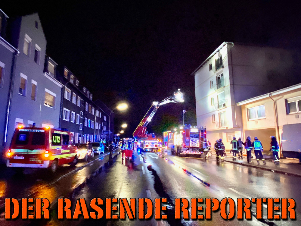 Sie bemerkten eine Rauchentwicklung und Feuer im Keller. Als die ersten Einheiten eintrafen, war der Treppenraum des fünfgeschossigen Wohnhauses komplett verraucht. Auf einem straßenseitig liegenden Balkon machten sich Bewohner bemerkbar. Eine sofort in Stellung gebrachte Drehleiter rettete die Personen. Mit mehreren Trupps unter Atemschutz wurde im Keller das Feuer gesucht und gelöscht, parallel durchsuchte man den total verrauchten Treppenraum nach Personen ab. Im hinteren Teil des fünfgeschossigen Gebäudes wurden die Bewohner mit tragbaren Leitern gerettet. 18 Bewohner wurden gerettet und in einem Bus der Stadtwerke vom Rettungsdienst versorgt. Insgesamt wurden 6 Verletzte mit Verdacht auf Rauchgasintoxikation verschiedenen Krankenhäusern zugeführt.