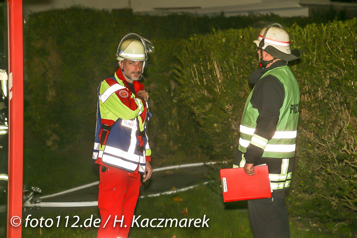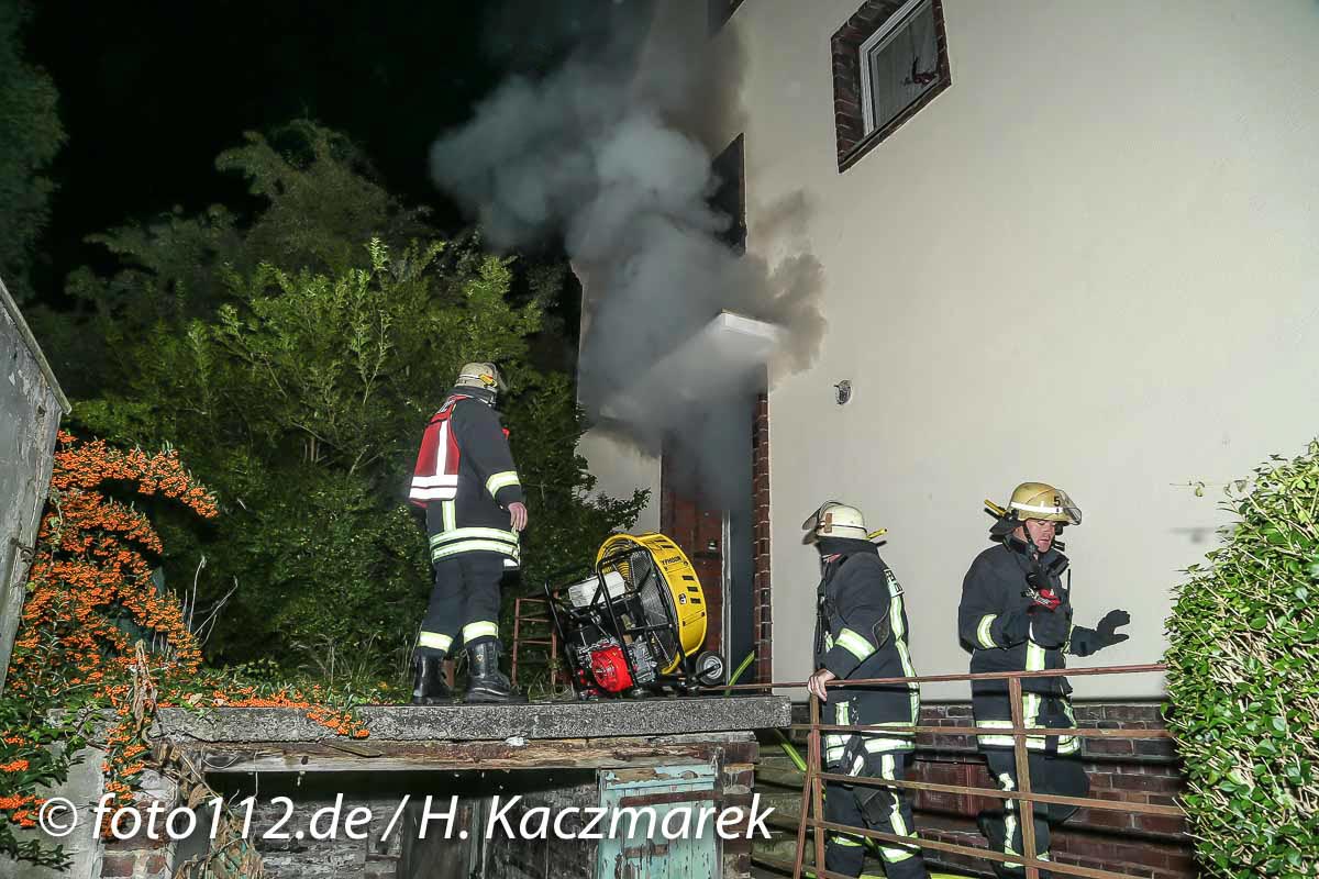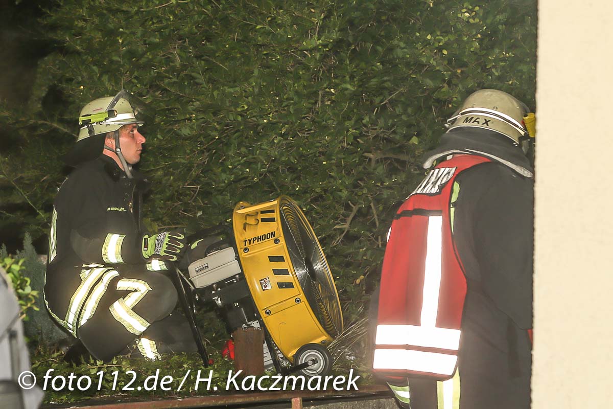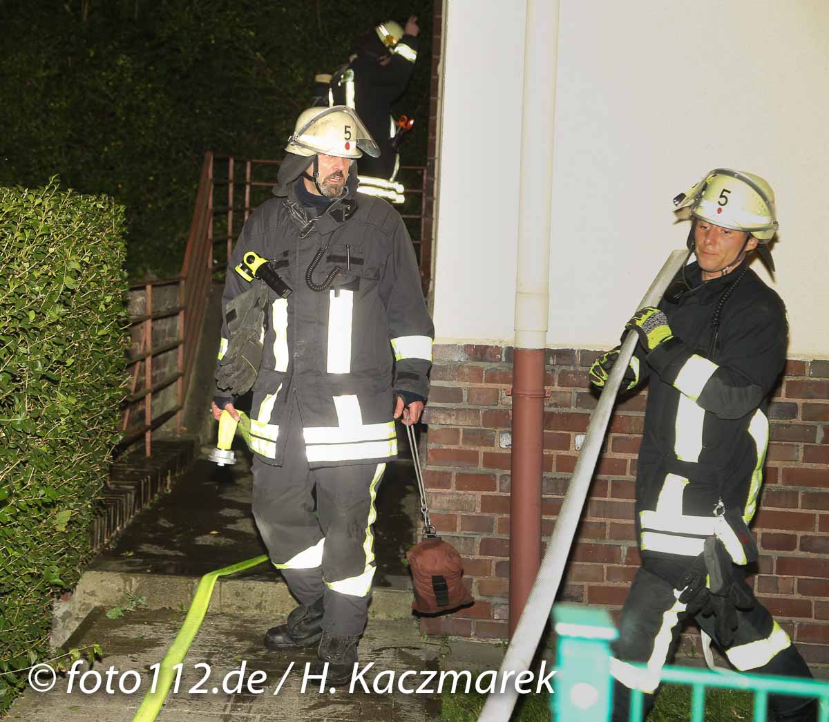 Im ersten Obergeschoß wurde zudem eine bettlägerige Seniorin vermutet. Daraufhin ging umgehend ein Atemschutztrupp zur Menschenrettung in das Gebäude vor. Nach dem Öffnen der Hauseingangstür schlugen dem Trupp bereits die Flammen entgegen, sodass sich die Einsatzkräfte erst den Weg bahnen mussten. Um dem vorgehenden Trupp den Rückweg freizuhalten wurde umgehend ein weiterer Trupp vorgenommen, der das Feuer im Keller und Kellerabgang bekämpfte.