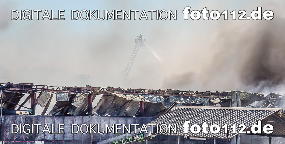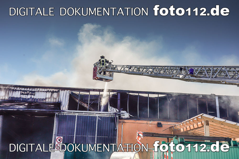 Um 9:15 Uhr wurde Vollalarm ausgelöst. An der Einsatzstelle, wo mittlerweile mehrere Hallen im Vollbrand standen, waren ca. 200 Feuerwehrleute im Einsatz.