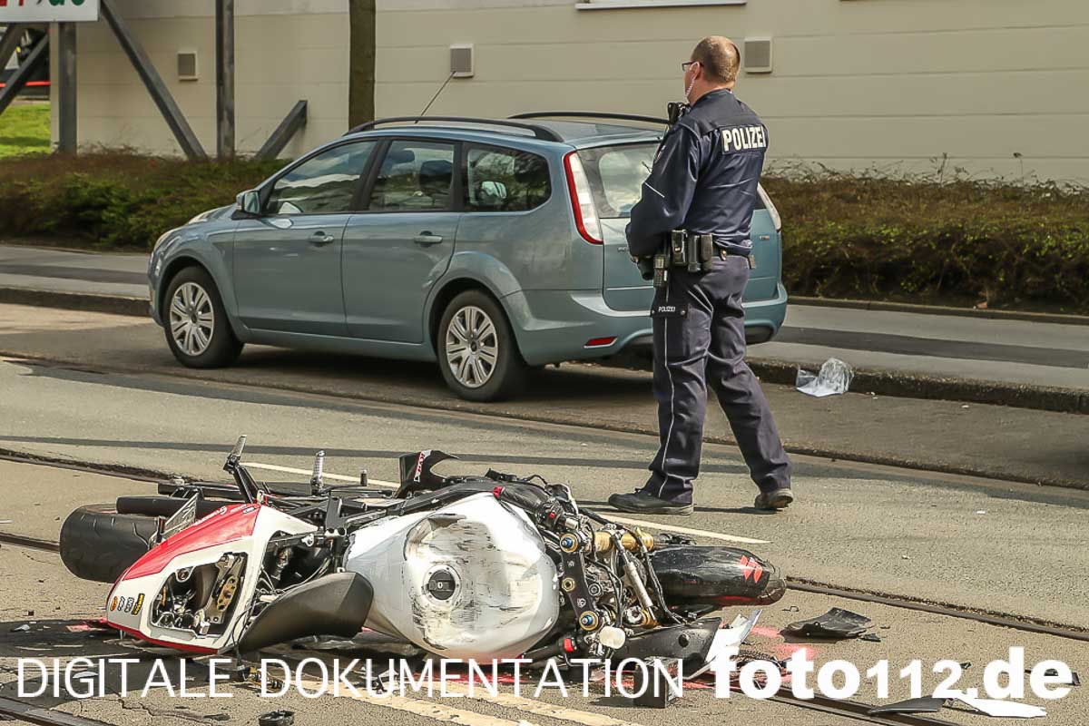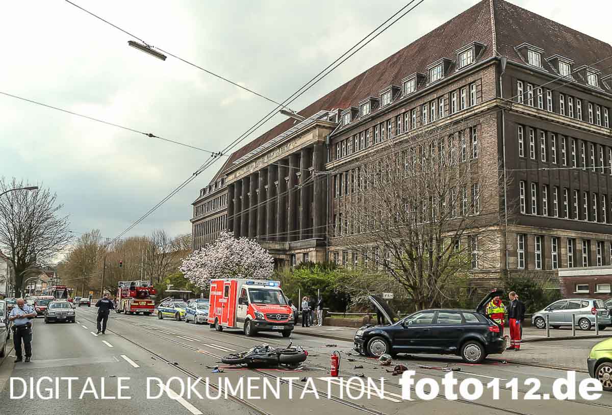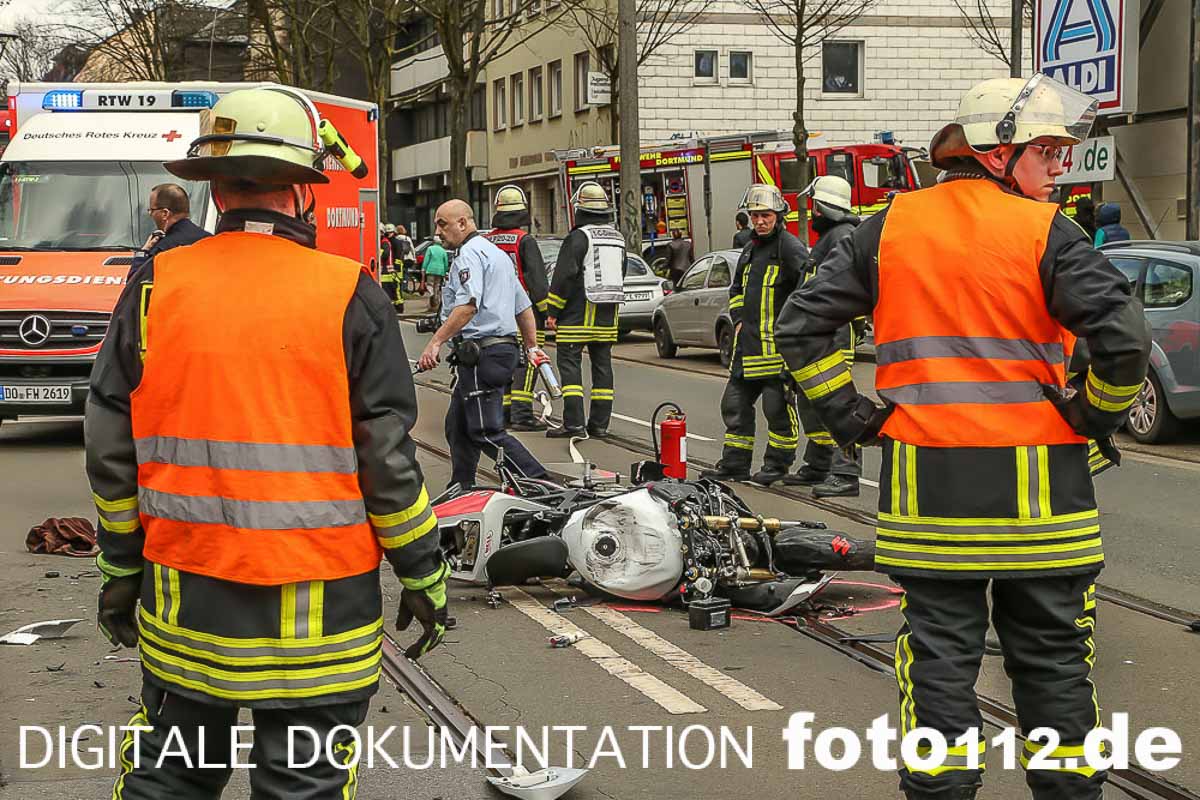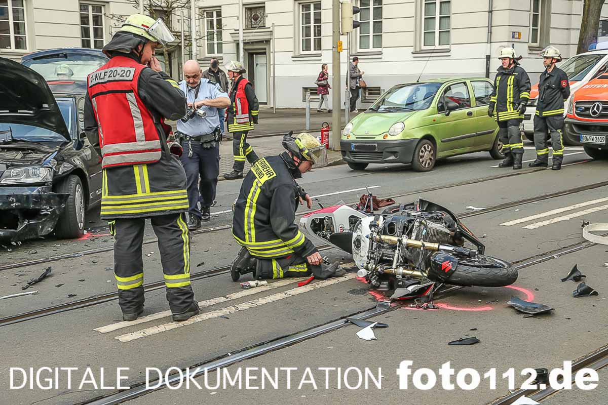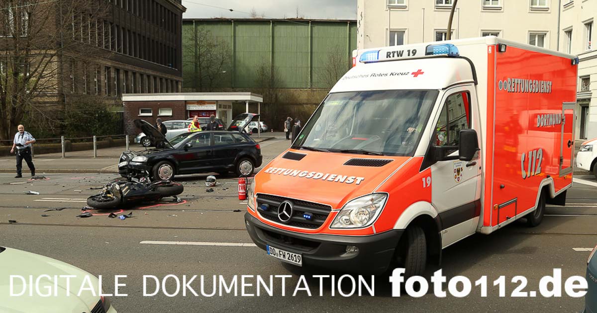 2016.04.04 – Folgenschwerer Motorradunfall gegen 14:50 Uhr auf der Rheinischen Str. in Dortmund.