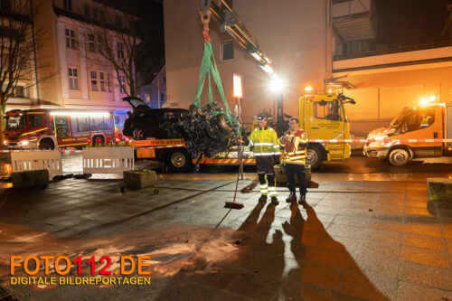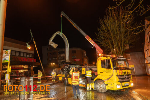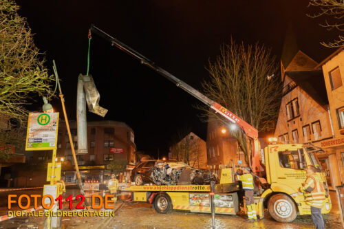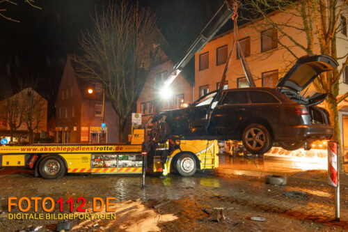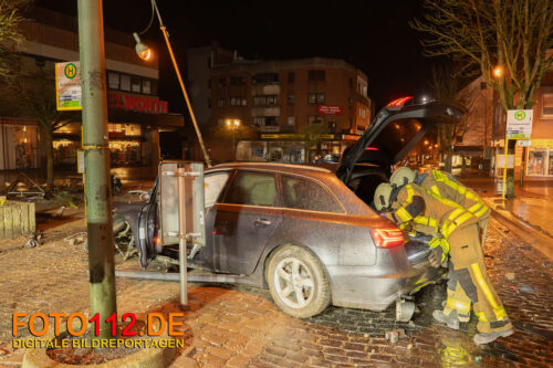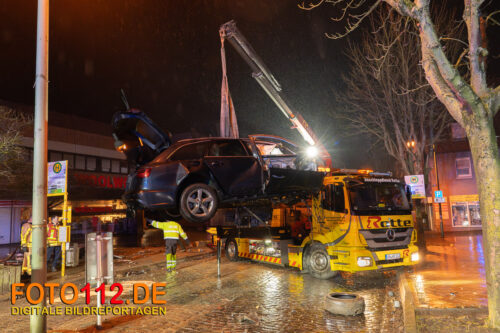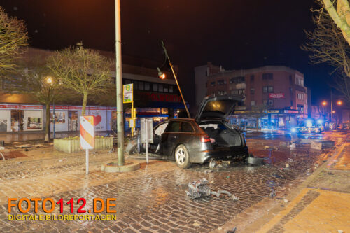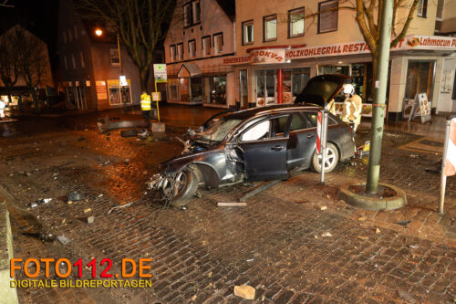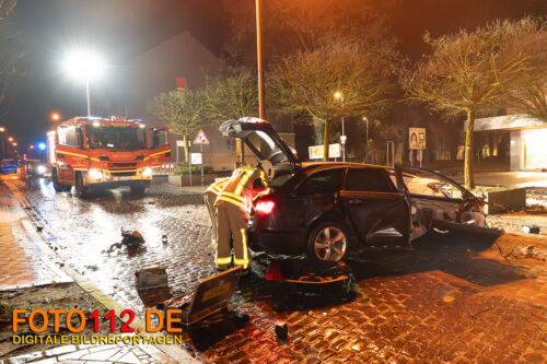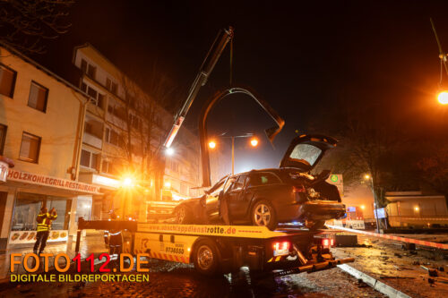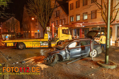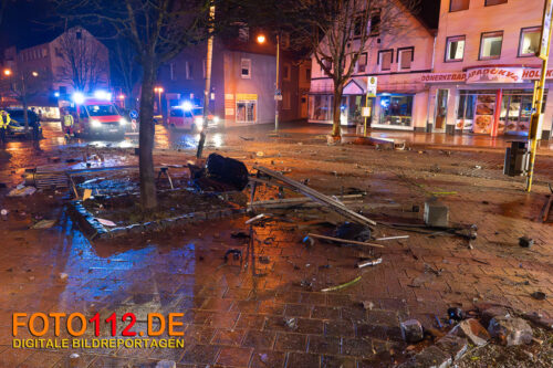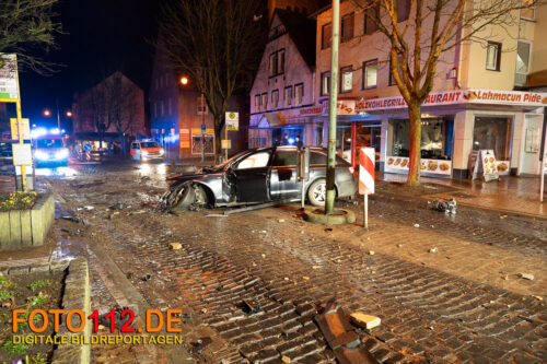 - 11.02.2026 – Um kurz vor 4 Uhr rückte die Feuerwehr Waltrop zu einem Verkehrsunfall zur Hochstraße in Waltrop aus. Beim Eintreffen fanden die Einsatzkräfte ein riesiges Trümmerfeld vor. Ein PKW Kombi aus Richtung Bahnhofstraße mit stark überhöhter Geschwindigkeit kommend, verlor in Höhe der Woolworth die Kontrolle über sein Fahrzeug und hinterließ ein riesiges Trümmerfeld. Der Fahrer flüchtete, kam aber wenig später zurück. Er wurde vom Rettungsdienst versorgt und unter Notarztbegleitung einem Krankenhaus zugeführt. Der Motorblock lag ca. 80 Meter weiter. Aber schaut selbst.