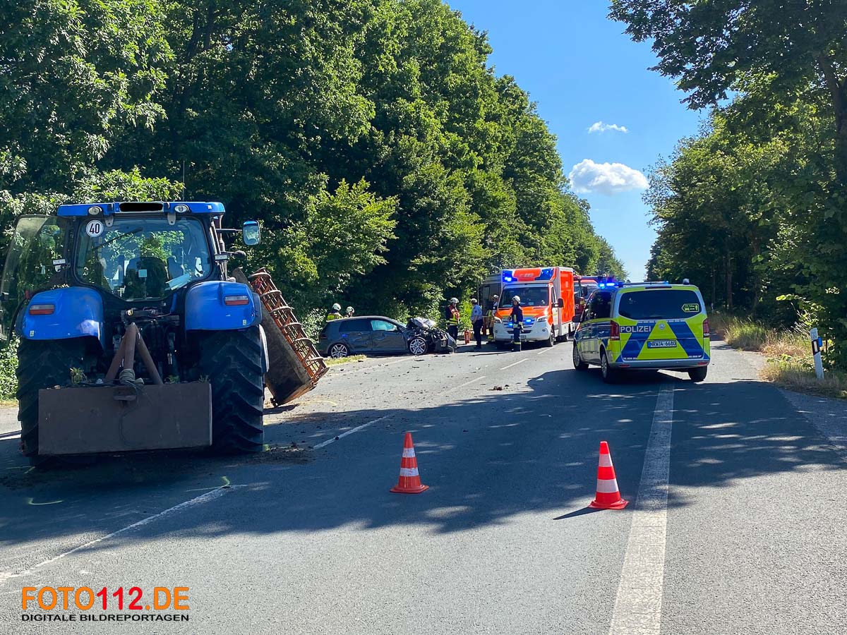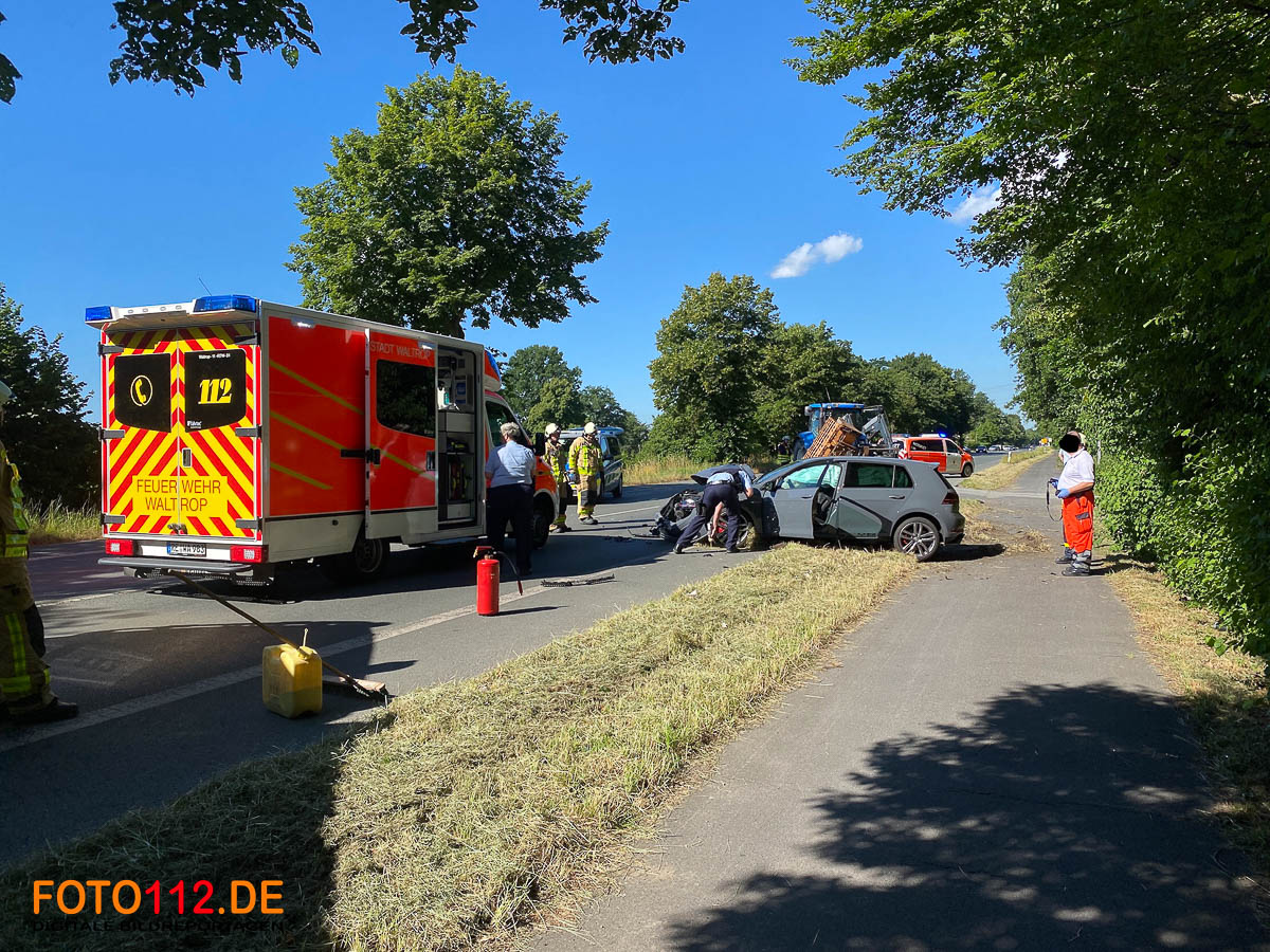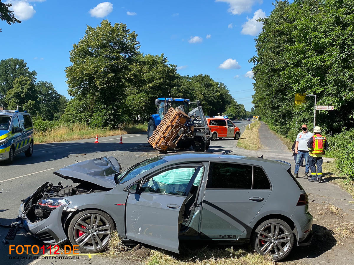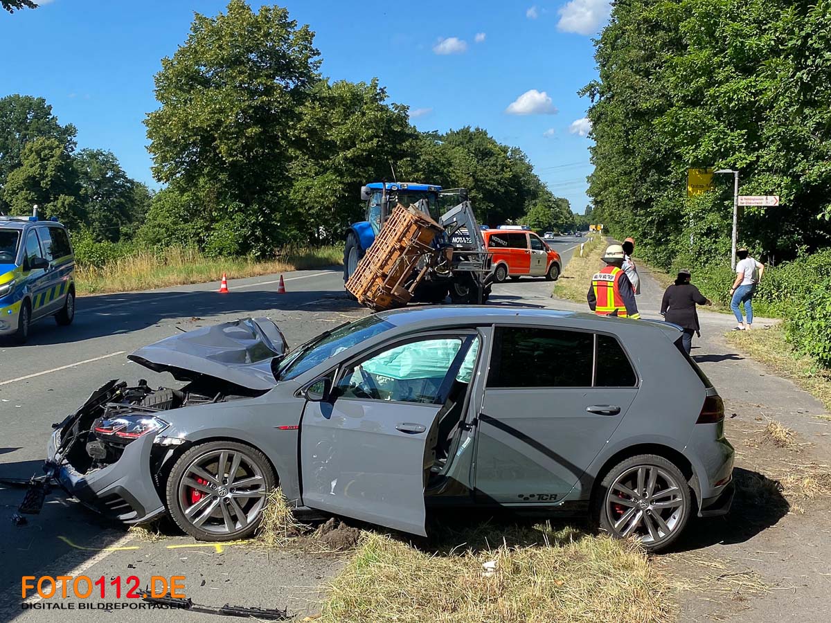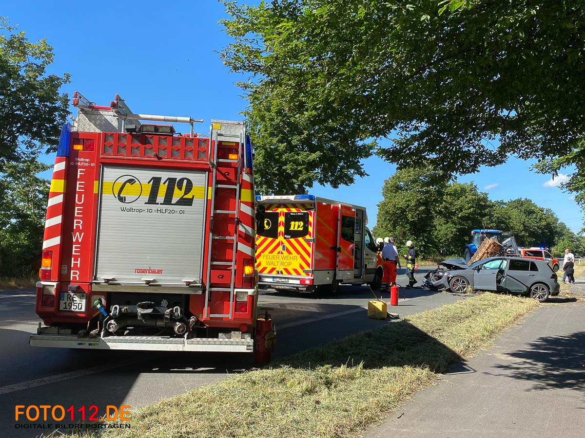 Bei dem Crash wurde der Fahrer eines Golf schwer verletzt und nach der Versorgung des Rettungsdienstes einem Krankenhaus zugeführt. Der Traktorfahrer erlitt leichtere Verletzungen und wurde ebenfalls in ein Krankenhaus verbracht. Der Unfall ereignete sich vermutlich bei einem Überholvorgang. Für die Zeit der Unfallaufnahme war die Recklinghäuser Straße komplett gesperrt. Die Feuerwehr Waltrop streute ausgelaufene Betriebsmittel ab.